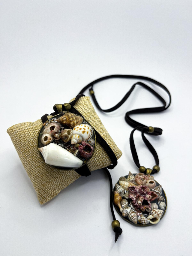🔹 Diseños con conchas naturales: colgantes que encapsulan auténticos tesoros del mar —conchas, corales y caracoles— en una composición delicada y artesanal.