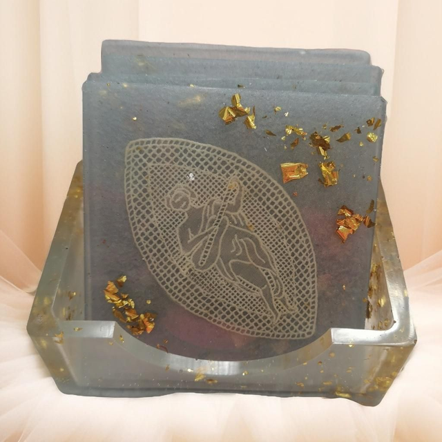 Estos posavasos artesanales están elaborados en resina epoxi, decorados con hojuelas de pan de oro y una pieza central de tela de encaje antigua, que aporta un toque vintage y elegante. Cada pieza es única, con detalles cuidadosamente incrustados que realzan su exclusividad. Perfectos para decorar y proteger tus superficies con estilo. Se presentan en un elegante soporte a juego, también hecho en resina con detalles dorados.